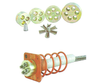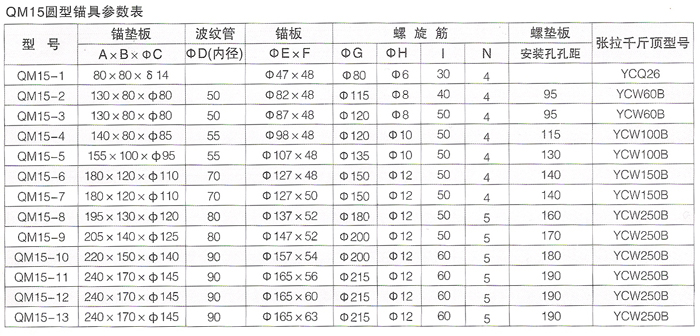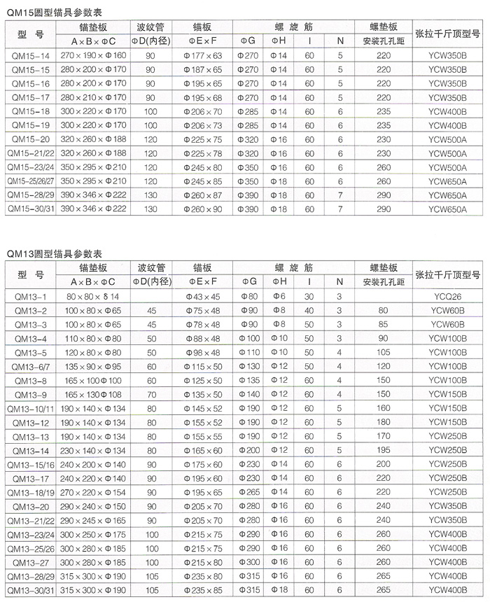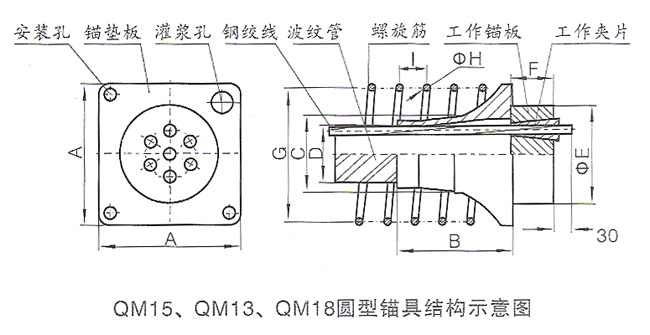 QMV張拉端錨具由夾片、錨環(huán)、錨墊板以及螺旋筋四部分組成,夾片是錨固體系的關(guān)鍵部件,其形式為二片式,用合金鋼制造。QMV13系列錨具用于錨固Ф12.7、Ф12.9鋼絞線(xiàn);QMV15系列錨具用于錨固Ф15.2、Ф15.7鋼絞線(xiàn);QMV18系列錨具用于錨固Ф17.8鋼絞線(xiàn);QMV22、QMV28錨具分別用于外徑Ф21.8和Ф28.6鋼絞線(xiàn)的單根錨固和張拉。