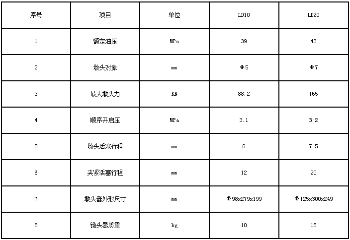 四、使用方法及注意事項 1、工作油壓選用:使用46號液壓油,在特殊嚴寒或酷熱地區適當調整,油壓保持清潔,定期更換。 2、使用新油管前,管內應經(jīng)過(guò)油清洗干凈后方能使用,接頭處保持清潔,無(wú)泥沙或其他污物。 3、鐓頭器可配用各種型號的高壓油泵,但必須按其額定油壓使用。 4、墩頭時(shí),本機由于油缸體積小,升壓快,使用前應先將油泵安全閥調定在墩頭油壓方可充油,以避免突然升壓過(guò)高,損壞機件。 5、新購鐓頭器開(kāi)始運轉時(shí)可能會(huì )發(fā)出〝咝咝〞響聲,這是機身內部留有空氣的緣故,空載運轉數次后會(huì )自行消失。7 6、墩頭部位各零件應經(jīng)常保持清潔,定時(shí)拆洗除銹,并注意: 1)重裝夾片時(shí),注意不使三片間小彈簧扭壞。 2)夾片與錨環(huán)錐形接觸面加油潤滑。 3)由于彈簧加工誤差,需要更換彈簧時(shí)宜選擇三個(gè)高度,剛度相等的彈簧配入,以保證夾片間間隙均勻。 4)每次拆洗重裝后,建議經(jīng)數次空載運行后才使用,以調整夾片間間隙均勻。 7、銹蝕過(guò)于嚴重的鋼絲宜在墩頭端部14cm長(cháng)度內徑除銹后進(jìn)行墩頭,否則拆洗頻繁,影響工效。 五、整機裝拆注意事項 整機在工地條件下不宜經(jīng)常裝拆,如必須拆下時(shí),要注意: 1、按構造圖裝配,密封圈方向不能裝反。 2、順序閥與回油閥二個(gè)小孔尺寸一樣,特別注意不要將二個(gè)不同剛度的彈簧裝錯。 3、順序閥經(jīng)拆過(guò)后,應更換同樣規格的鋼珠,以保證密封,達到順序控制作用。 4、裝配時(shí),全部零件都要清洗,決不允許夾帶泥沙、污物,并加油潤滑,以免機件拉毛,損害密封圈而報廢。 5、本機拆裝專(zhuān)用扳手如用戶(hù)需要可向我公司訂購或在訂貨時(shí)提出要求。 六、LD10型液壓鋼絲鐓頭器裝箱單